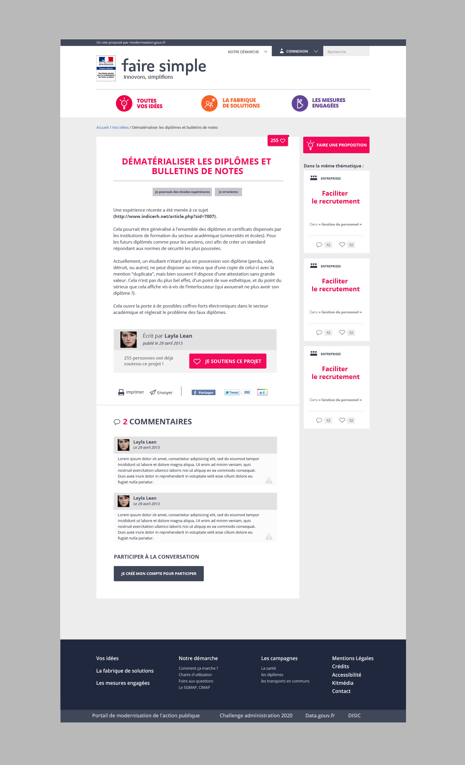Complete design of the digital platform "Faire simple" (= Keep it simple). This collaborative space allows citizens to give input on the simplification of the French administration.